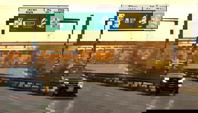 Skiltene ved Storebæltsbroens betalingsanlæg har forskellige farver for at gøre det nemt at overskue, hvilken bane du skal vælge.