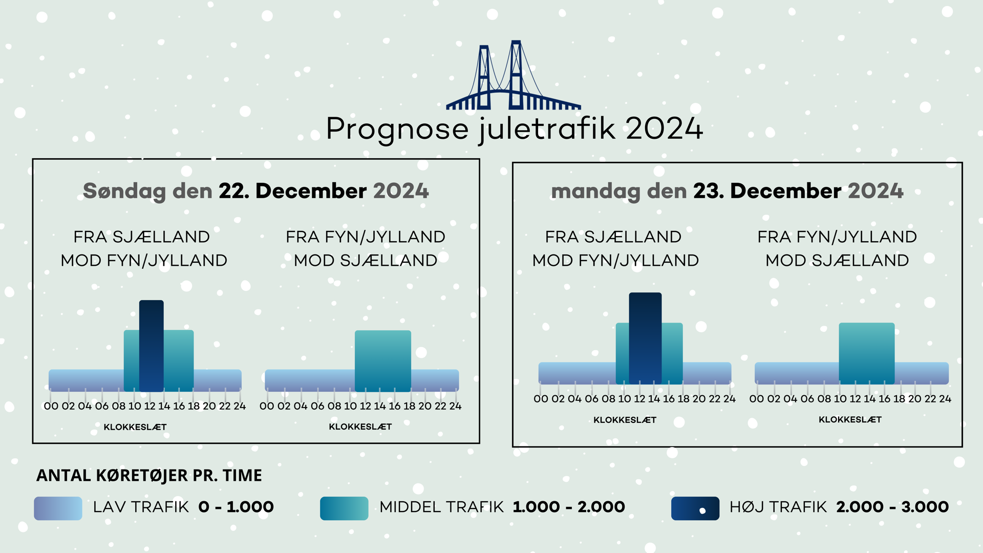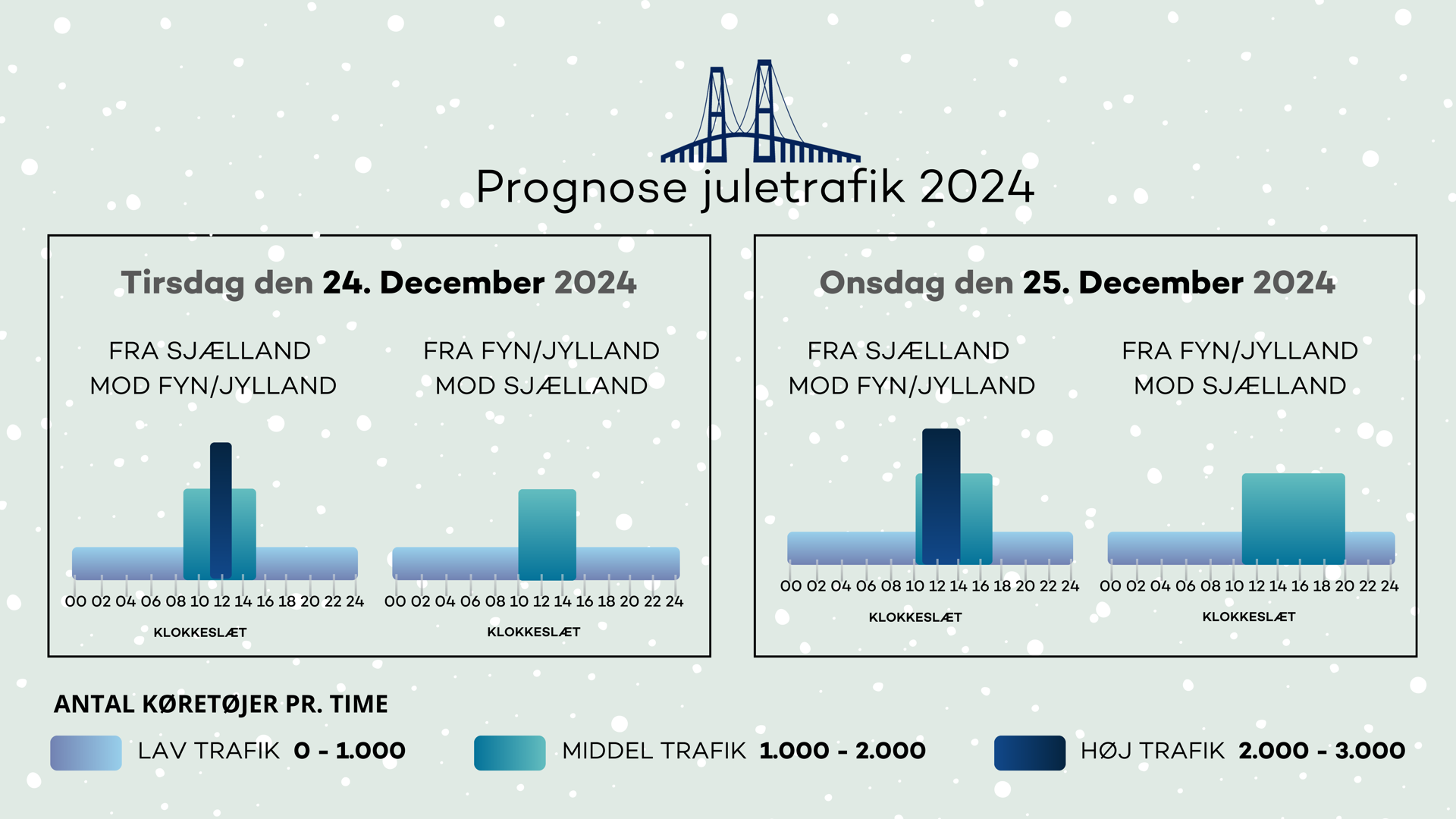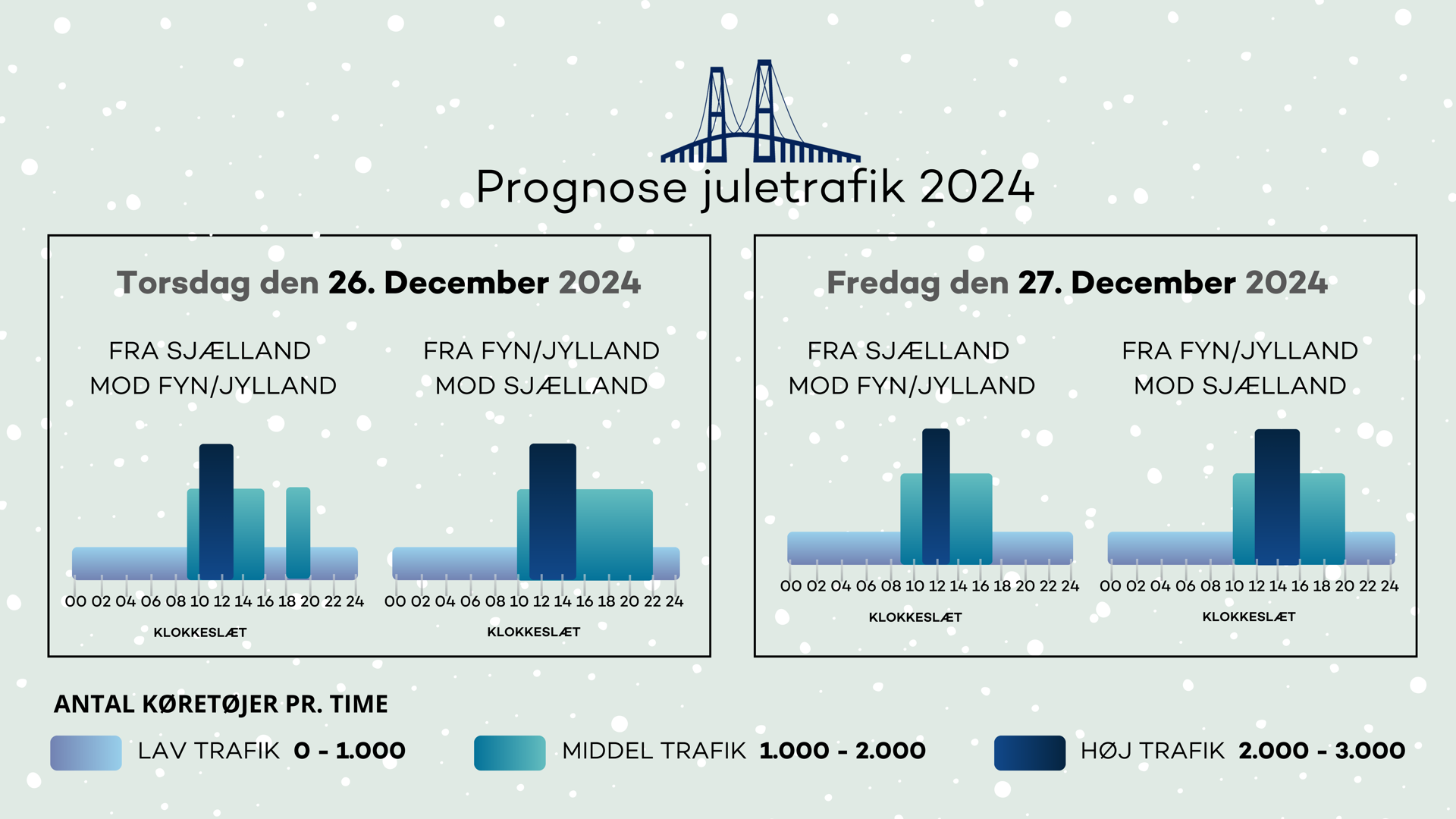 Den travleste rejsedag vil være den 26. december, hvor trafikken forventes at være tættest mellem klokken 10-15. På Storebaelt.dk kan kan man orientere sig om vejr- og trafikforhold samt finde prognoserne for, hvordan trafikken fordeler sig på de store rejsedage hen over julen.