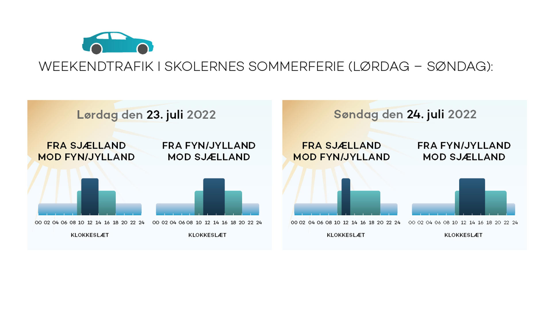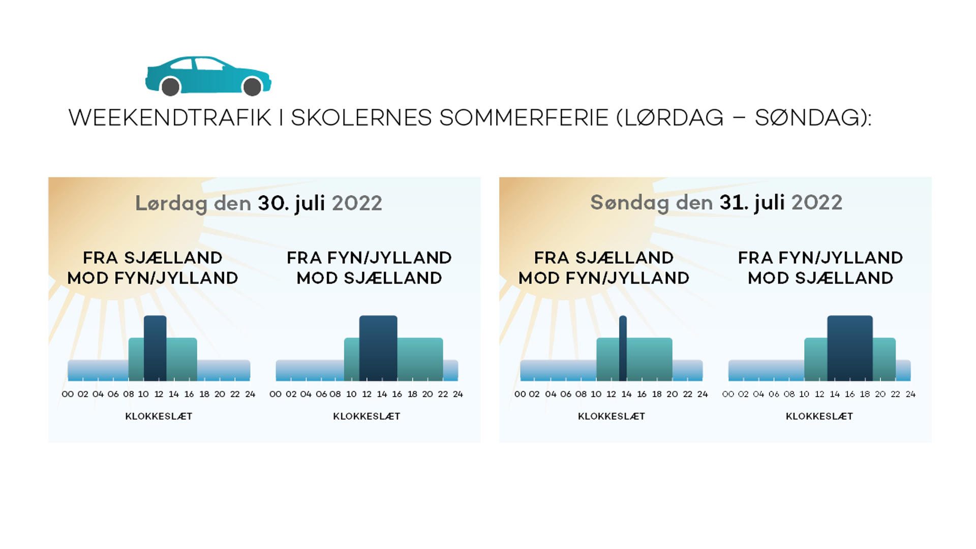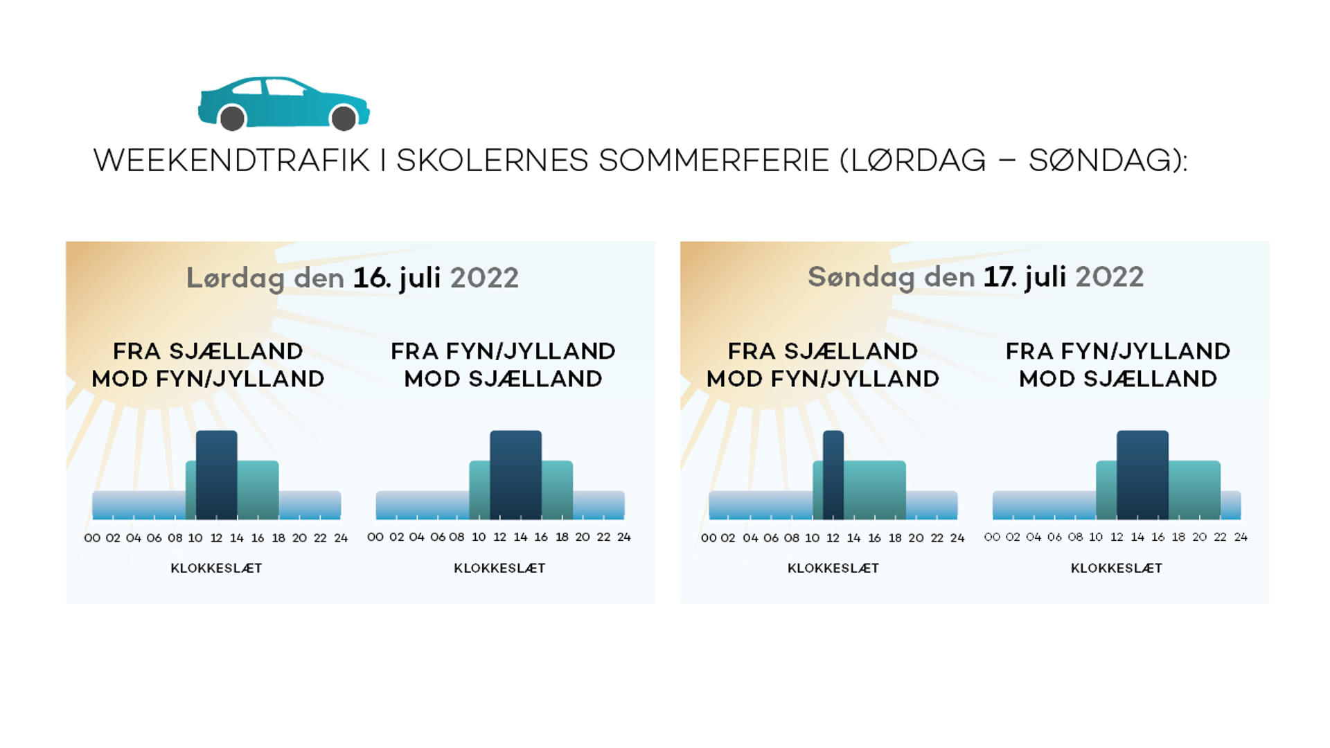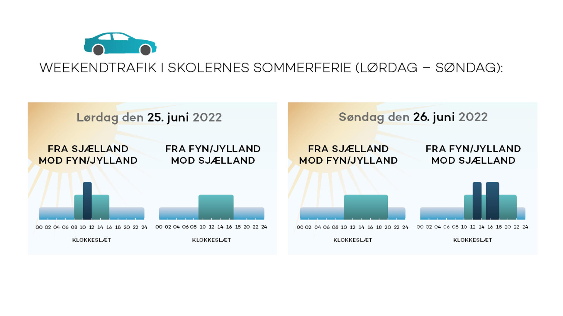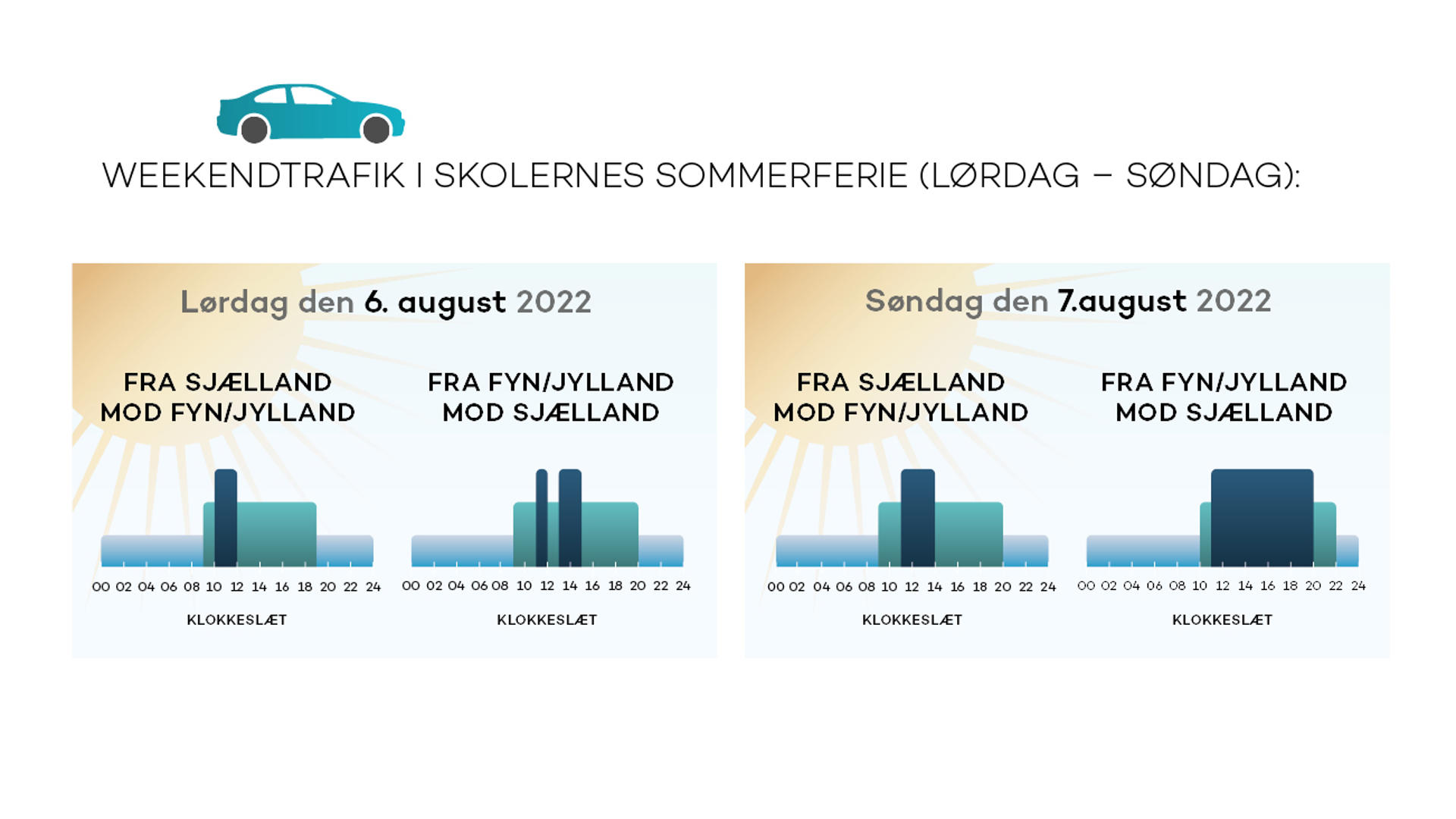 Mod Fyn og Jylland forventes flest biler at passere gennem betalingsanlægget på lørdage mellem kl. 10 og kl. 14, mens der i retning mod Sjælland vil være travlt både lørdage og søndage mellem kl. 12 og kl. 17.